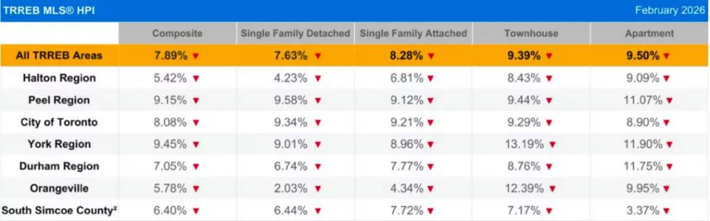 MLS®房屋价格指数(MLS® HPI)综合基准在2026年2月同比下降7.9%。平均售价为1,008,968加元,较2025年2月下降7.1%。经季节性调整后,MLS® HPI综合指数和平均售价均较2026年1月的数据有所下降。