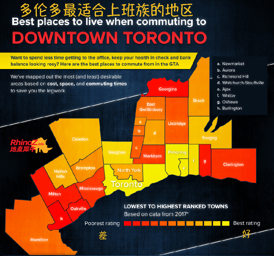 随着年青一代的移民成长起来,开始考虑成家立业,一个新的问题出现在所有地产经纪的面前:和老一代移民不同,年轻人更喜欢市中心的生活,也有很大的机会在多伦多Downtown工作。那么,对他们来说,在什么地方置业更划算呢? 就这个问题,TheRedPin公司采用2017年的数据对GTA的27个市镇进行了横向比较,主要指标为房屋价格(包括地区房屋均价和每平方尺的均价),和平均每天上下班所需的时间。对各市镇的指标进行分析对比之后,打分、排序,做出了一个“性价比”,或者说买房置业最值当地区的排行榜。 今天这期文章,犀牛来和大家分享一下他们的研究成果。 咱们一起看图: 在上图中,颜色越红的地方越不适合通勤上班的人居住,明黄色的地方是最适合通勤者置业的地方。 从图中我们发现,这份报告认为最适合通勤者置业的地方除了包括多伦多市区、旺市、Pickering、Ajax和Whitby;最不适合通勤者置业的地方是杜兰郡的Oshawa,约克郡的Markham、Georgina,皮尔郡的Mississauga,荷顿郡的Milton、Burlington和Oakville。...