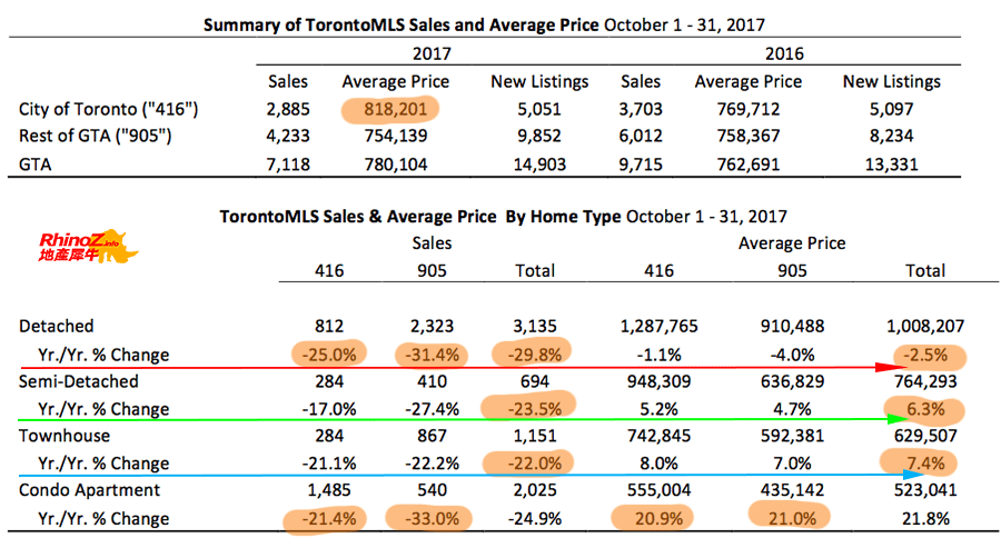 2017年11月2日,多伦多地产局主席 Tim Syrianos 公布了大多伦多的地产报告。今天犀牛就来和大家一起来看看最新的地产形势。 先来看数据: 从上面的表中,我们可以看到:在多伦多市区,上个月的房屋均价为81万8千,905区的均价为75万4千。如果从房型来看,独立屋在销量下降30%左右的情况下,价格也都有所下降;半独立屋和镇屋在销量下降23%的情况下,价格分别上升了6%和7%;condos公寓方面,则和其他房型区别较大,在销量下降25%的情况下,价格同比上升了22%。...