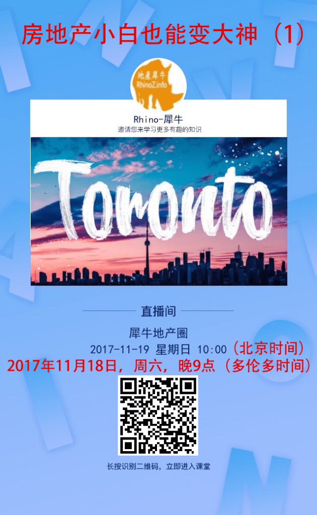 一直有朋友要求犀牛给大家做一些房地产相关的知识培训,但是各种原因总是未能实现。既然无论如何都要拖延,那不如就从这周开始。 直播会讲什么? 我会从一个普通购房者的角度出发,从浅入深的讲讲在多伦多购买房地产需要注意的方方面面。内容会涉及多伦多地理构成和人员构成,房屋买卖的流程和注意事项,以及如何报税、避税等知识。 适合什么样的人? 各种阶段、各种水平都可以,我会从零基础讲起,陪你一起变成大神。 准备的话题大约有这些:...