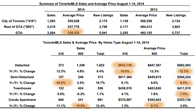 2014年8月18日,多伦多地产局公布了8月大多地区的半月地产报告,这一次犀牛就和大家聊聊最新的地产形势。咱们先来看图: 有几个重点大家先来一起关注一下: 1)整个GTA的各种房屋的综合均价为$538,530; 2)416区独立屋的均价为$843,138,905区独立屋的均价为$647,387; 3)416区的独立屋在销量的年同比增加12%的情况下,售价年同比增长10.6%; 4)416区的半独立屋的销量年同比增长30.9%;...