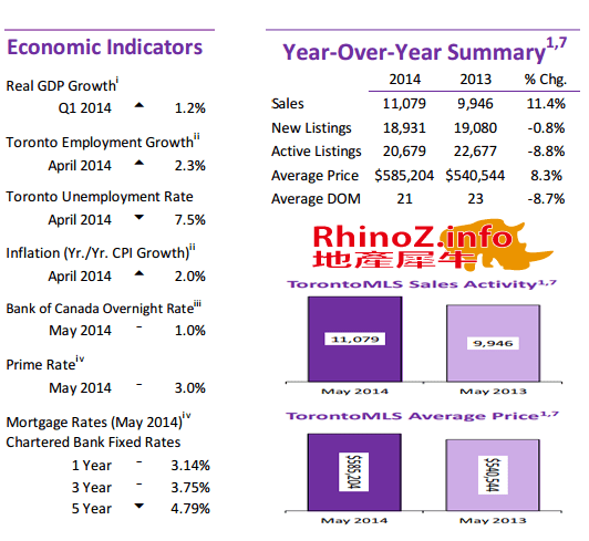 今天(6月4日),多伦多地产局公布了5月大多地区地产报告: 从表中我们可以看出,在2014年5月,整个大多地区,不管那种房型,包括condo,都出现了年环比量价齐升的现象。这是以往从未出现过的现象,不知道是不是condo重新焕发青春的标志。 按照犀牛版的规矩,咱们调出上个月的数据来做个对比: 从相邻两个月的数据对比中可以看出: 416区的freehold方面,除了townhouse的价格继续保持强势之外,独立屋和半独立屋的价格都有所回调; 416区的condo后劲十足,价格比一个月前上升了4.4%!...