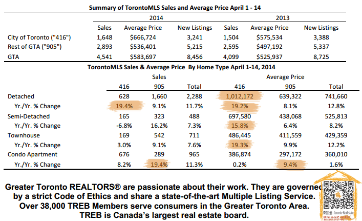 2014年4月17日,多伦多地产局公布了4月上半月的大多地区地产报告。从这份报告中,我们可以看到好几个非常重要的变化:416区的独立屋平均售价超过了100万加元!相对于去年同期的均价,增长将近20%!在此同时,同比销量的增长也接近20%! 在416区独立屋量价齐升的同时,416区半独立屋环比均价增长16%、镇屋环比均价增长19%,905区condo环比售价增长近10%。 为了一个更广阔的的视野,犀牛引入另外一个维度:连续时间段的房屋销量与均价对比。下面是3月的地产报告,咱们来看一下: 从两个时间段的数据对比可以看出:4月上半月416独立屋的均价比3月增长13%,涨势凶猛。地产的春天真的来了。
