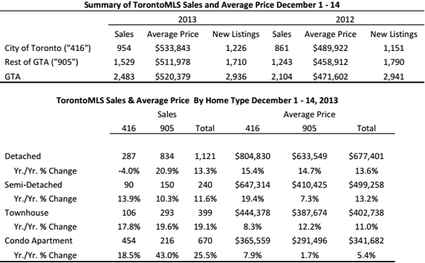 多伦多2013年12月18日消息,在12月前两周,整个大多地区一共通过MLS系统进行了2,483桩地产交易。比去年同期上涨了18%,而新盘的数量则与去年同期持平。 “整个GTA房产交易的关键仍然集中在房屋供给充分与否。随着房屋购买者不断的认可房贷利率,我们可以看到在2013年下半年出现了一个购房高峰。而这也正是由仍然在不断减少的挂盘数量决定的。而也正是因为同一个原因,我们看到房屋的价格还在不断上涨。”多伦多地产局总裁Dianne Usher如是说。 房屋的售价在12月中达到$520,379,比去年同期的$471,602上涨10%。 大多地区的房屋库存预计仍然会下降,特别是包括独立屋、半独立屋和无管理费镇屋在内的低层住宅仍然会供不应求。多伦多地产局高级市场经理Jason Mercer如是说。