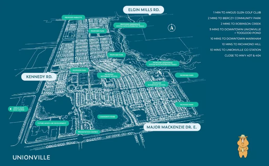项目位于万锦核心地段Kennedy Rd & Major Mackenzie Dr,坐落于历史悠久的渔人镇Unionville的北边,著名高尔夫球场Angus Glen Gold近在咫尺,邻近Bercy Square、Bruce’s Mill Conservation Park等公园,依山傍水、绿水环绕,深受崇尚自然、追求健康生活人士的喜爱。