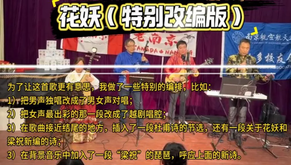 刀郎的“花妖”非常适合我们这种有中国民族乐器的乐队。为了让这首歌更有意思,我做了一些特别的编排,比如:1)把男声独唱改成了男女声对唱;2)把女声最出彩的那一段改成了越剧唱腔;3)在歌曲接近结尾的地方,插入了一段杜甫诗的节选,还有一段关于花妖和梁祝新编的